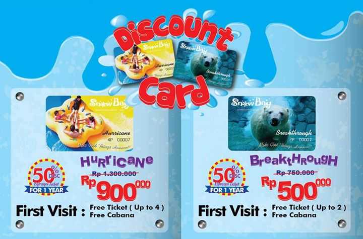 • Kartu diskon snowbay hurricane Rp 900.000 dari harga normal Rp 1.300.000. Diskon tiket masuk 50% untuk kunjungan selama 1 tahun. Sedangkan untuk kunjungan pertama berlaku.