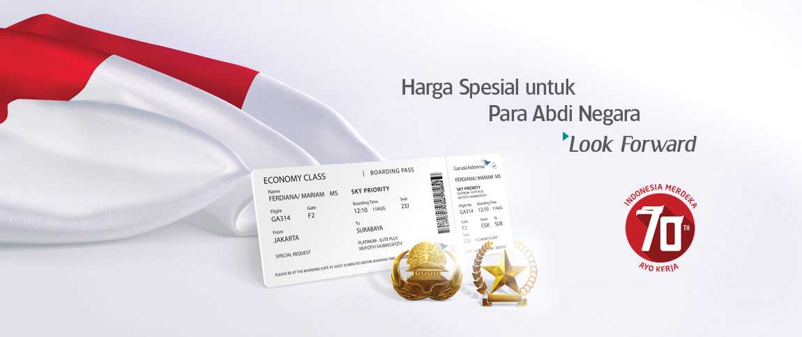 Garuda Indonesia sebagai salah satu maskapai bintang lima kebanggaan Indonesia turut menyemarakkan pesta Kemerdekaan. Sebagai wujud apresiasi kepada para abdi negara Garuda Indonesia memberikan diskon tiket pesawat hingga 70%. Potongan harga tiket ini berlaku untuk PNS dan Veteran beserta keluarga Inti. Keluarga inti yang termasuk dalam program ini adalah suami atau istri dan anak-anak maksimal 3 orang.